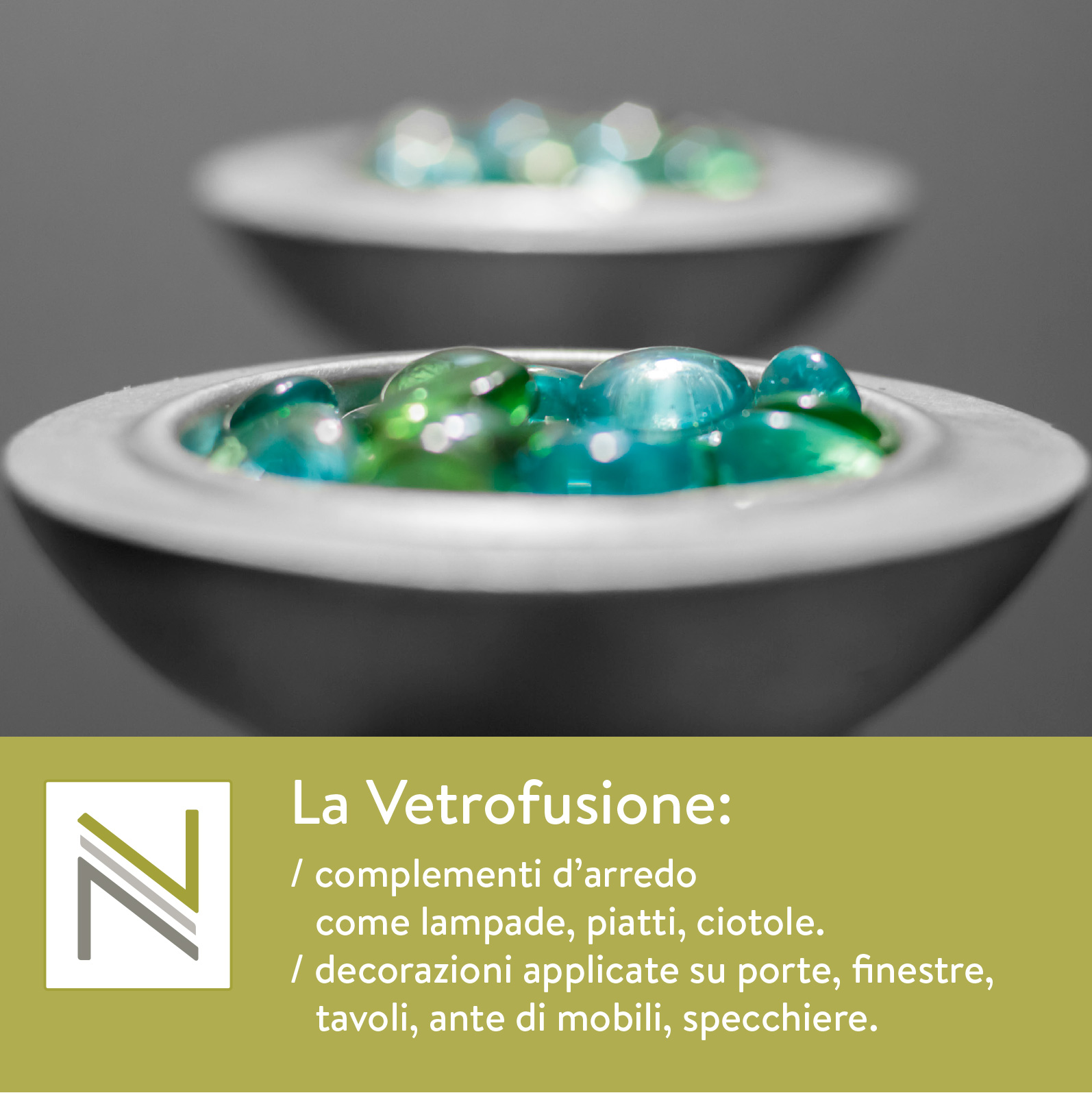 La vetrofusione è un delicato processo termico che consiste nel portare gradualmente una lastra di vetro alla temperatura di fusione di circa 800 gradi e poi di ricondurla ancora più lentamente alla temperatura ambiente. In questo modo è possibile fondere tra loro diverse tipologie di vetro per ottenere infine un unico e nuovo vetro decorato.