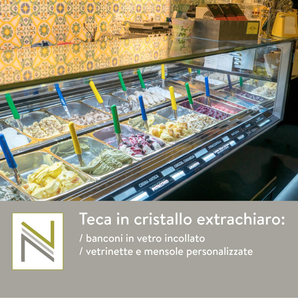 Vetreria Navacchia realizza banconi in vetro su misura per attività commerciali quali pizzerie, ristoranti, pasticcerie, bar etc… Offre la possibilità di personalizzare il bancone utilizzando diversi tipi di vetro o aggiungendo mensole, anche su banconi esistenti. I vetri possono essere incollati fra loro con appositi adesivi UV, oppure assemblati all’interno di strutture con profilo in alluminio o acciaio.